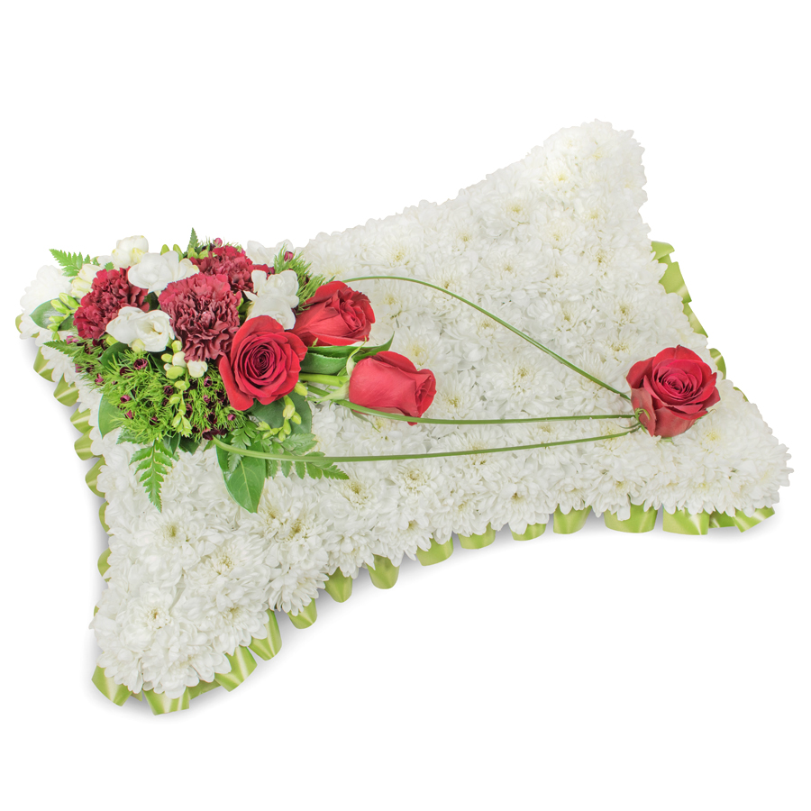 Convey your sympathies with our graceful sympathy flower arrangement. This elegant bouquet includes white chrysanthemums, classic red roses, fragrant white freesias, and deep dark red carnations, complemented by dianthus and bear grass for a unique and tasteful design.